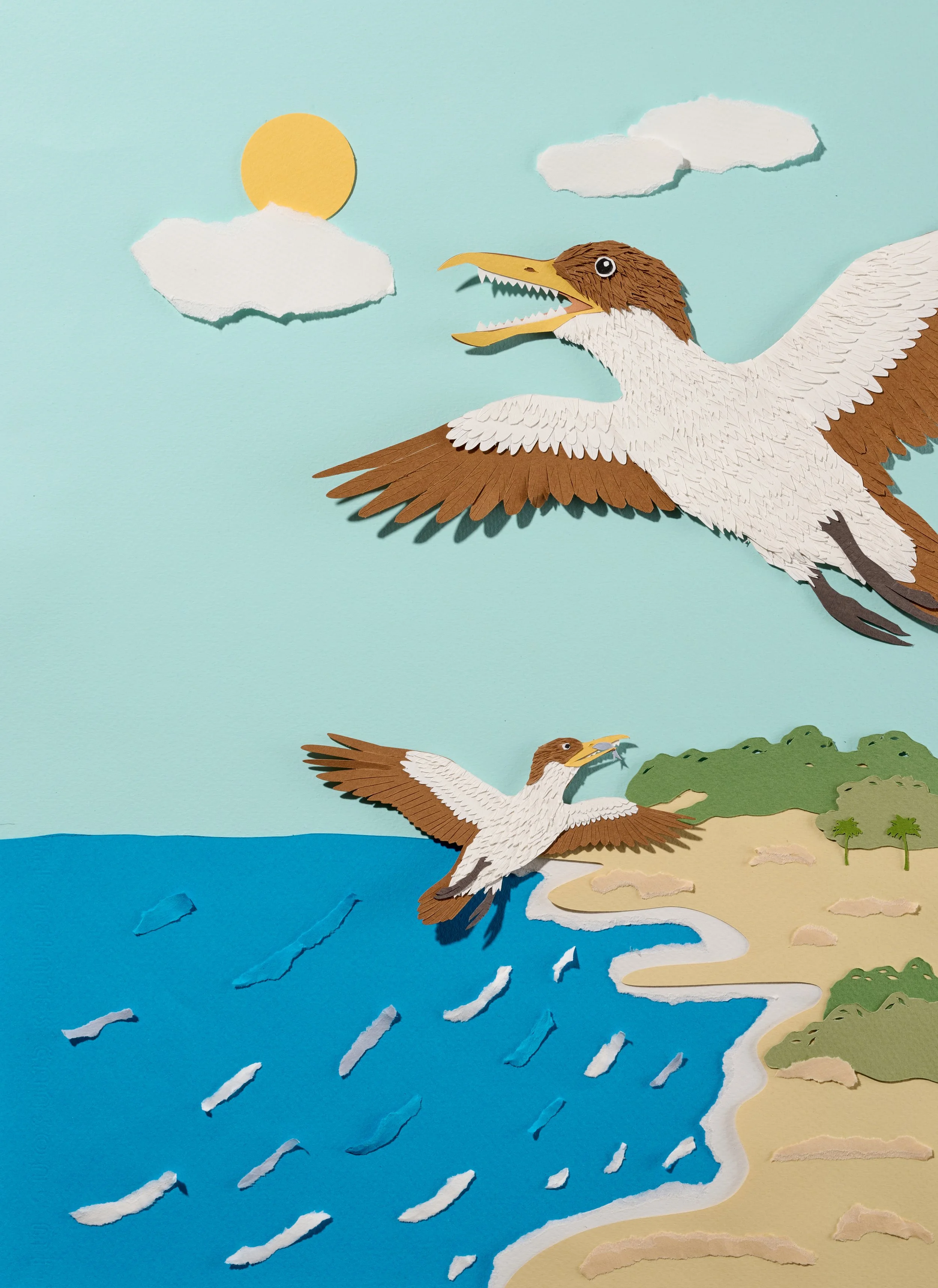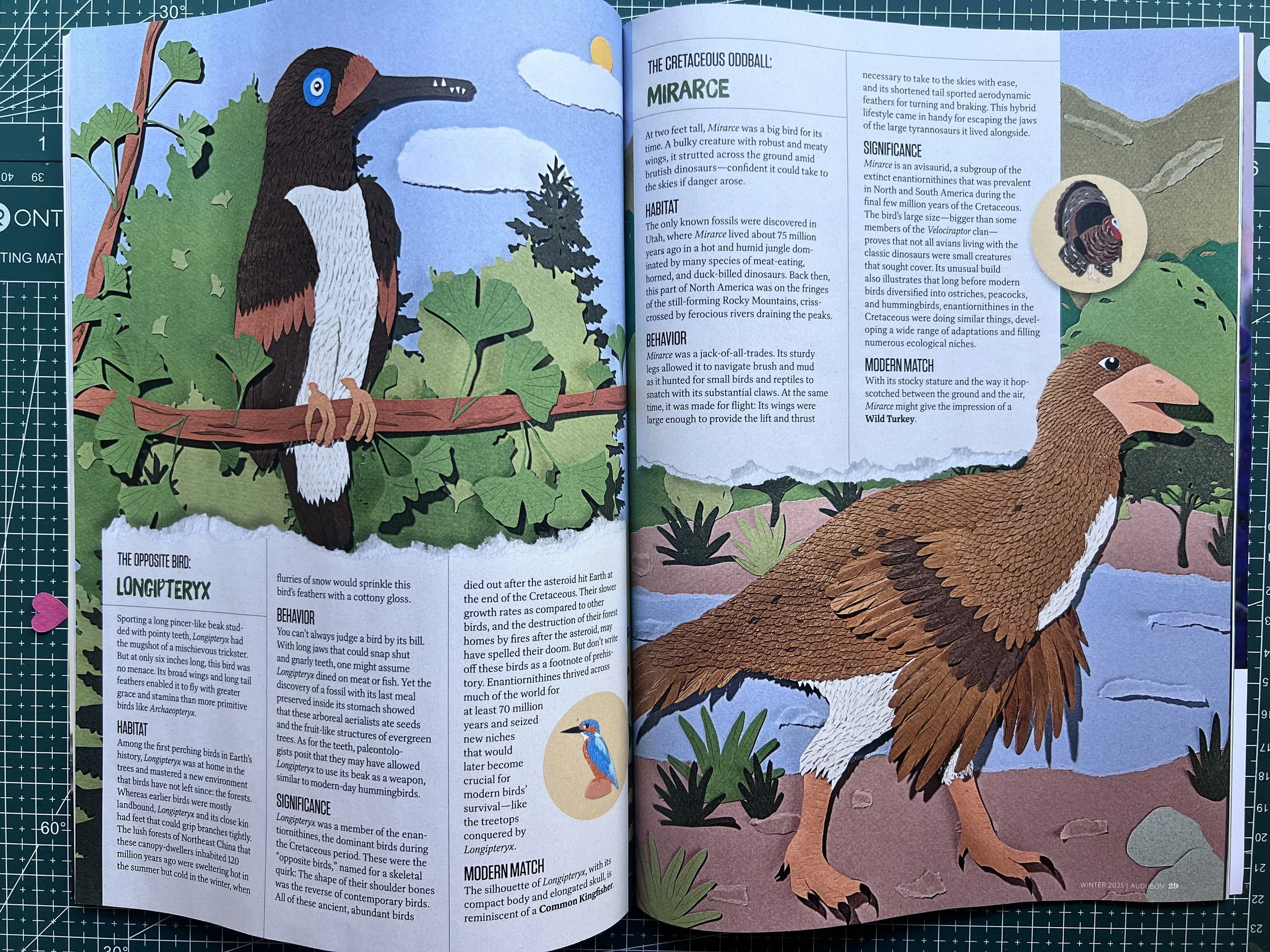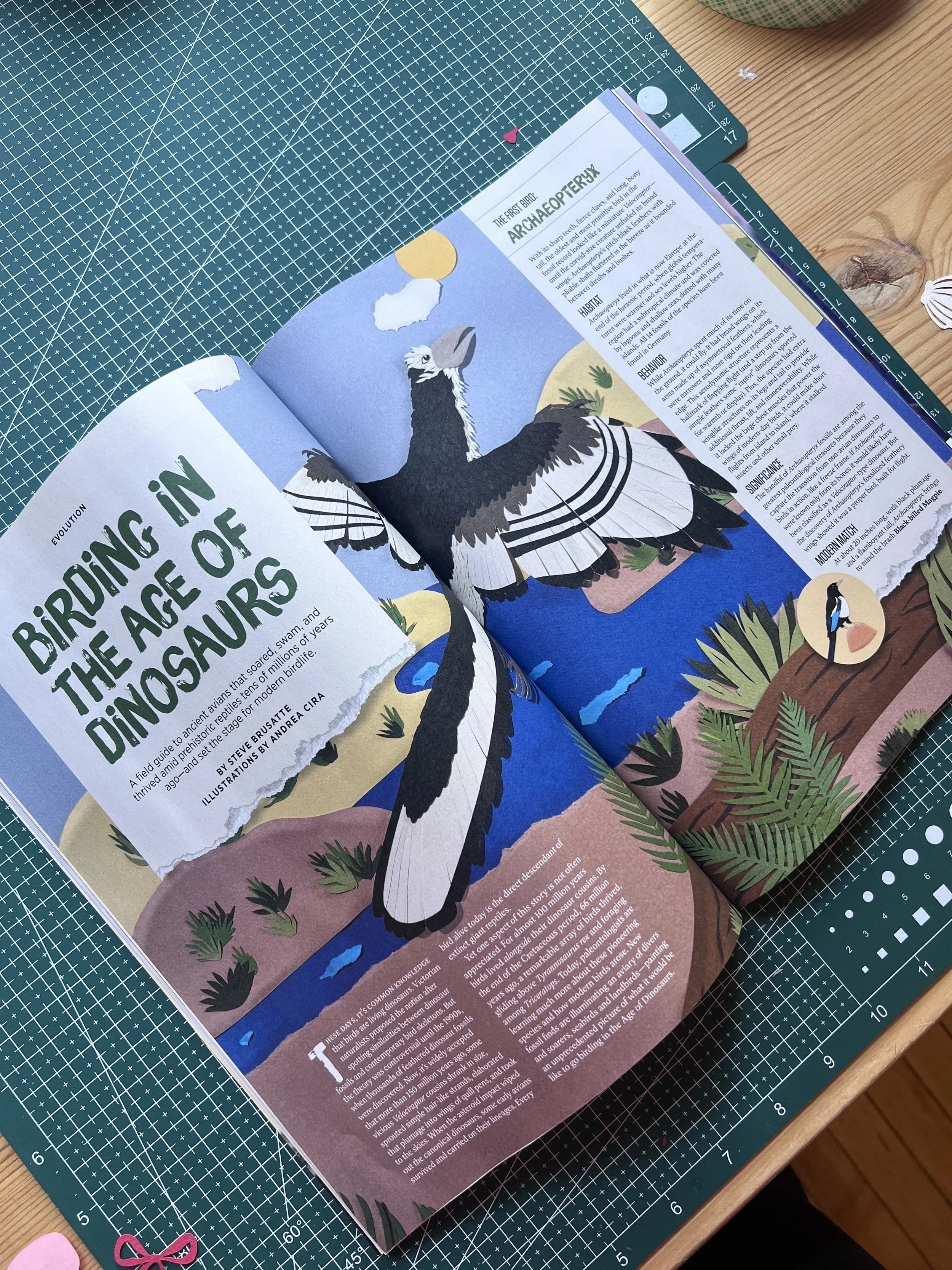 The feature included one full spread highlighting Archaeopteryx, along with four additional pages showcasing a range of prehistoric avian species. Each bird was cut from paper, and then photographed to preserve texture, depth, and shadow.
